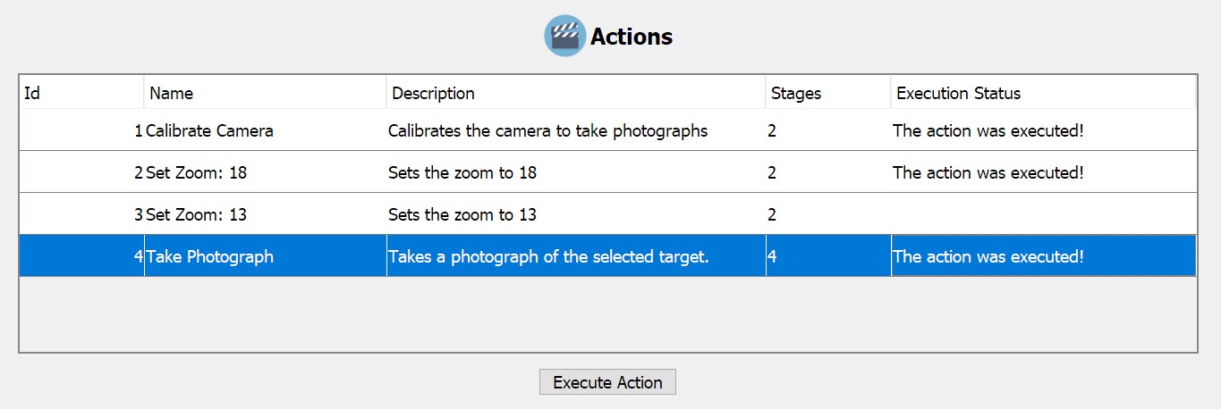 7. Execute sequentially the following actions “Calibrate Camera”, “Set Zoom: 18” and “Take Photograph”: