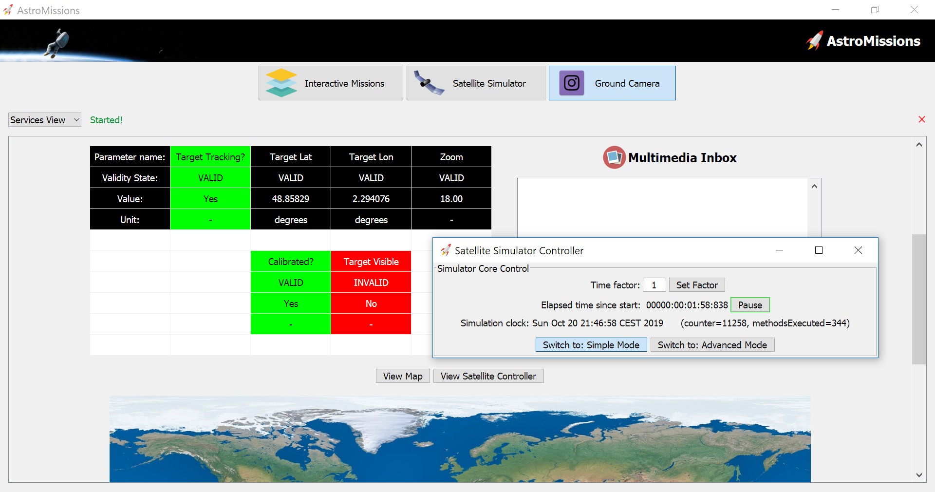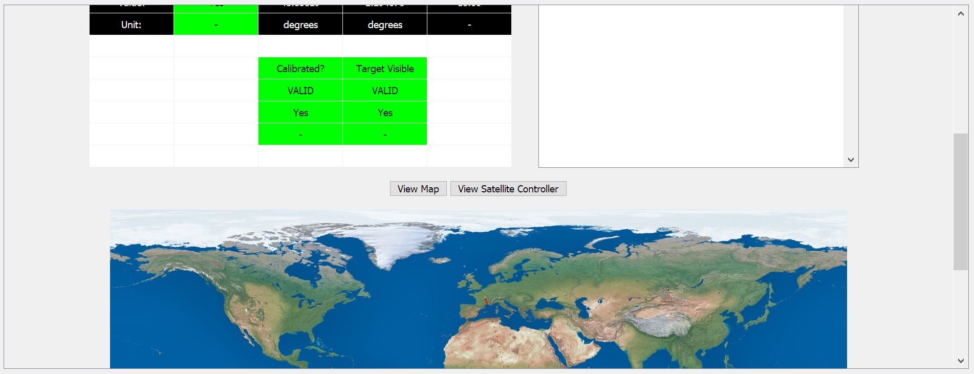 The World Map will appear below the two buttons and the Satellite Simulator Controller will appear as a separate window. Change the “Time Factor” to 20 in the Satellite Simulator Controller and wait a few seconds. As soon as the spacecraft reaches the Mediterranean Sea (below Europe), change the “Time Factor” to 1. Be fast on the next steps as the target will only be available for a few seconds!