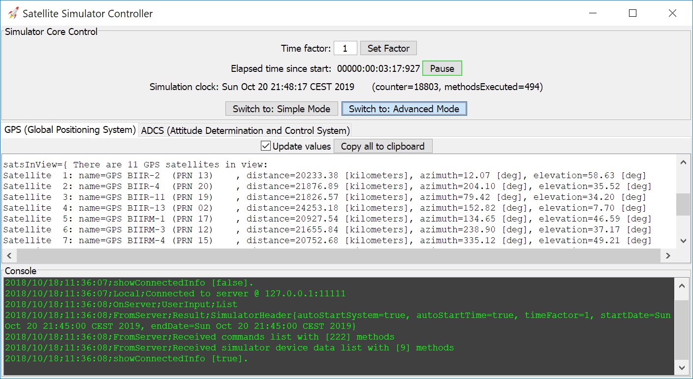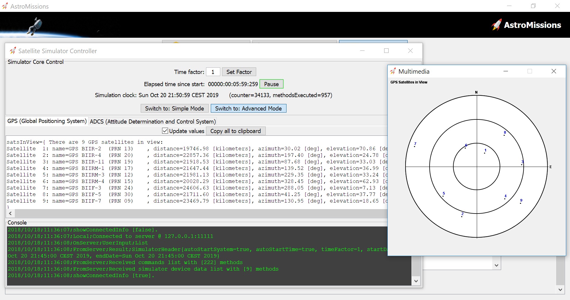 After pressing the button, the satellite simulator will start and a set of instruments will be displayed on the right side.
