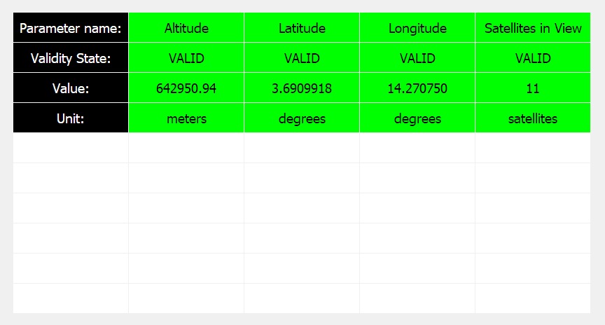 We can visualize the parameters available on the GPS Tracker instrument. These are also available directly on the Satellite Simulator parameters list. The parameters will switch color every time a new parameter value is received. The corresponding value of the parameter is on the “Value” field. For example, in the picture above, the altitude is of 660’670 meters or about 660 kilometers.